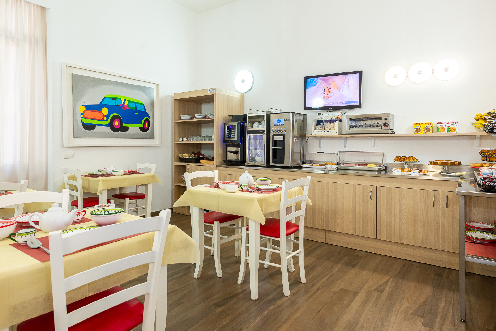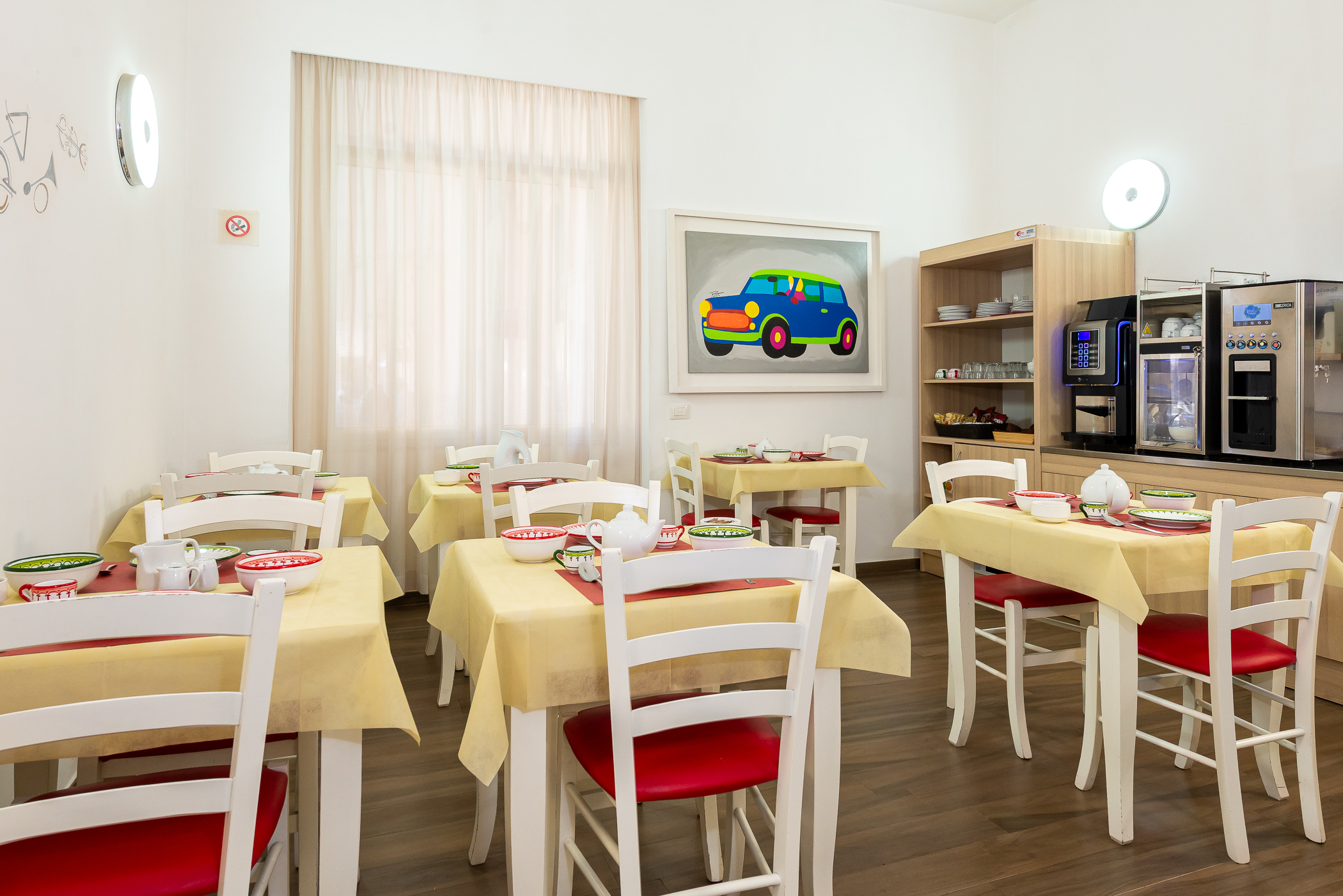 Inoltre, per un'esperienza ancora più comoda, nella stessa sala troverai un moderno dispenser che ti permetterà, su richiesta ma in totale autonomia, di preparare una bevanda calda o fredda. Potrai gustarla non solo durante la colazione, ma anche durante la giornata, rilassandoti in uno degli altri spazi dell'hotel.