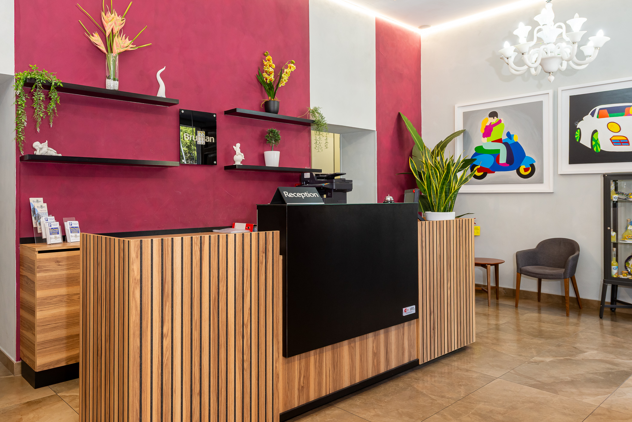Passeggiando attraverso gli ambienti è possibile ammirare una serie di opere d'arte moderne che caratterizzano l'Hotel Bruman come Art Hotel. Lo stile dinamico e fresco delle sale interne e delle camere rispecchia il vicino Corso Vittorio Emanuele, strada dello shopping e salotto della città.
